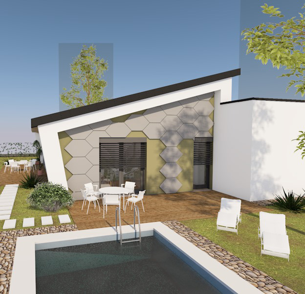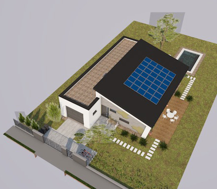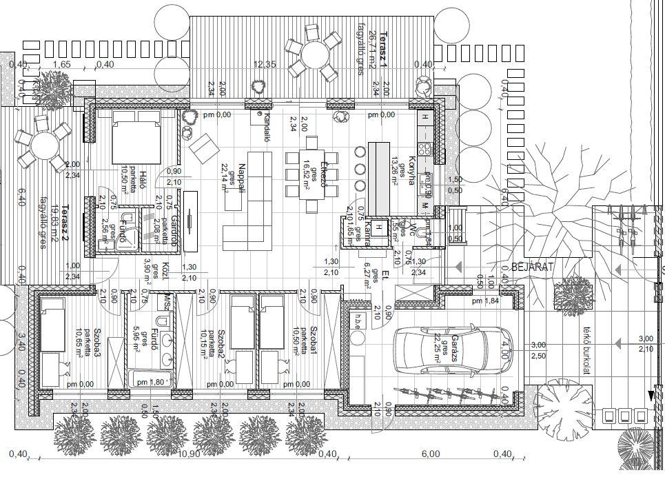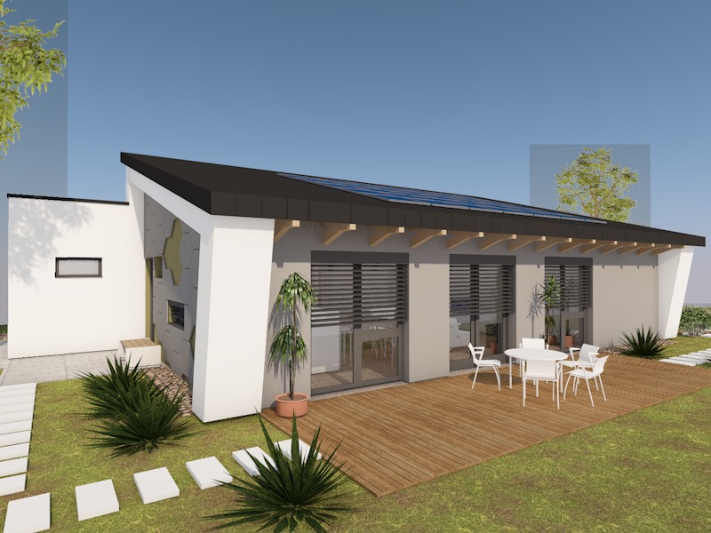 Ez a modern, egyszintes családi ház 117,68 m² nettó hasznos alapterületével, nappali + 3 szobás elrendezésével tágas és kényelmes életteret biztosít. A jól átgondolt alaprajzot egy fürdőszoba és külön WC egészíti ki. A két terasz (26,71 m² és 19,83 m²) ideális helyet kínál a szabadtéri pihenéshez és családi együttlétekhez. A 22,25 m²-es, lapostetős garázs modern megjelenést ad az épületnek, miközben praktikus parkolási lehetőséget nyújt. Az otthon energiahatékony működéséről hőszivattyús fűtés, napelemes rendszer energiatárolóval, valamint Loxone intelligens otthonautomatizálás gondoskodik.