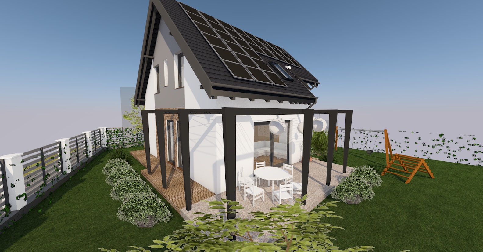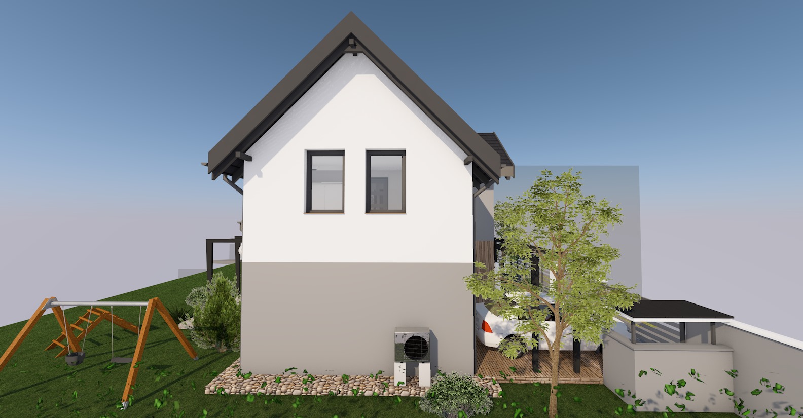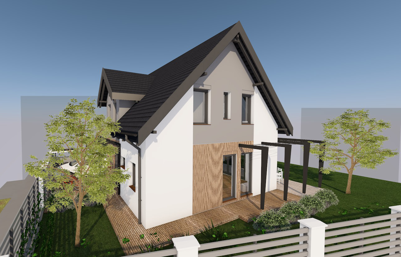 Ez a modern, kétszintes családi ház 105,9 m² nettó hasznos alapterületével, nappali + 4 szobás kialakításával ideális választás azok számára, akik tágas, jól kihasználható életteret keresnek. A földszinten 47,59 m², az emeleten 58,31 m² biztosít kényelmes elrendezést, két fürdőszobával és külön WC-vel kiegészítve. A 19,87 m²-es terasz kellemes kültéri pihenőhelyet kínál, míg a 14,09 m²-es garázs praktikusan illeszkedik az épülethez. Az otthon energiahatékony működését hőszivattyús fűtés, napelemes rendszer energiatárolóval és Loxone intelligens otthonautomatizálás biztosítja, egyesítve a modern technológiát és a kényelmet.