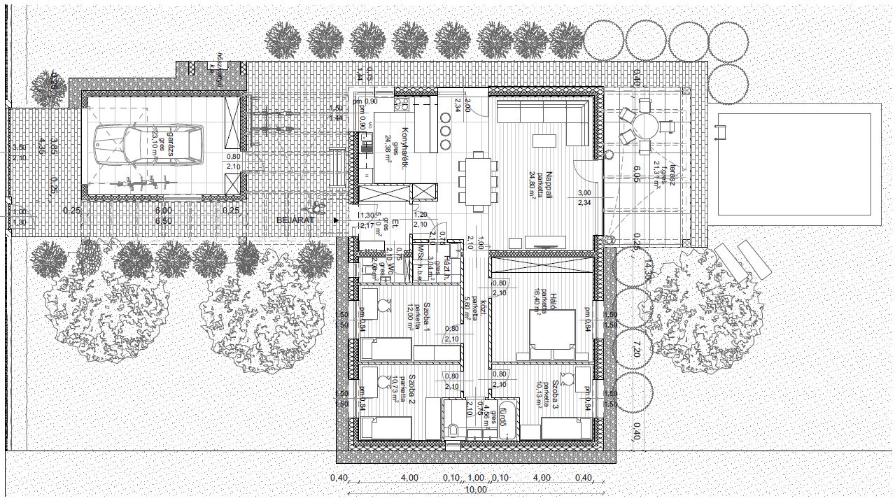 Ez az elegáns, lapostetős egyszintes családi ház 118 m² nettó hasznos alapterületével, nappali + 4 szobájával ideális választás nagyobb családok számára. A jól átgondolt alaprajz kényelmes életteret biztosít, 23,10 m²-es garázzsal kiegészítve. A 21,30 m²-es terasz tökéletes helyszínt nyújt a szabadtéri pihenéshez. Az otthon energiahatékonyságáról hőszivattyús fűtés, napelemes rendszer energiatárolóval, valamint Loxone intelligens otthonautomatizálás gondoskodik.